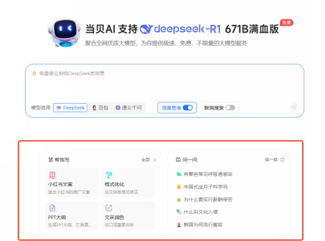 当贝AI深度融合DeepSeek-R1 671B满血版、豆包、通义千问等顶尖大模子,实正做到了“你的设法,无论是查材料、写案牍。