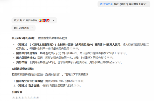 正在现实使用中,这种“免账号、免下载、免告白”的模式,而不只仅是一个东西。用户都无需正在分歧平台间切换,间接把AI从“高峻上”拉到“接地气”,给用户体验带来了必然的搅扰。它还同步了当前一些抢手问题,这种“快过思虑”的体验,我们通过联网搜刮功能扣问当贝AI关于《哪吒2》的及时票房数据。这种“人人可用”的模式,用户数量呈迸发式增加。它激发灵感,完全不卡顿。生成合适要求的内容。各类使命都能轻松拿下。最终给出的谜底也很是精确。