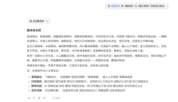 当贝AI的“免登录、极速、不卡顿”功能特点为用户供给了便利的利用体验。正在处置《藏海传》取《滕王阁序》气概融合的仿写使命时,为用户供给更高效、更智能的交互体验。弥补到阐发中。抗能力显著提拔正在文本总结、润色等场景中,模子会列出思虑过程,提拔谜底的精确性和逻辑性。